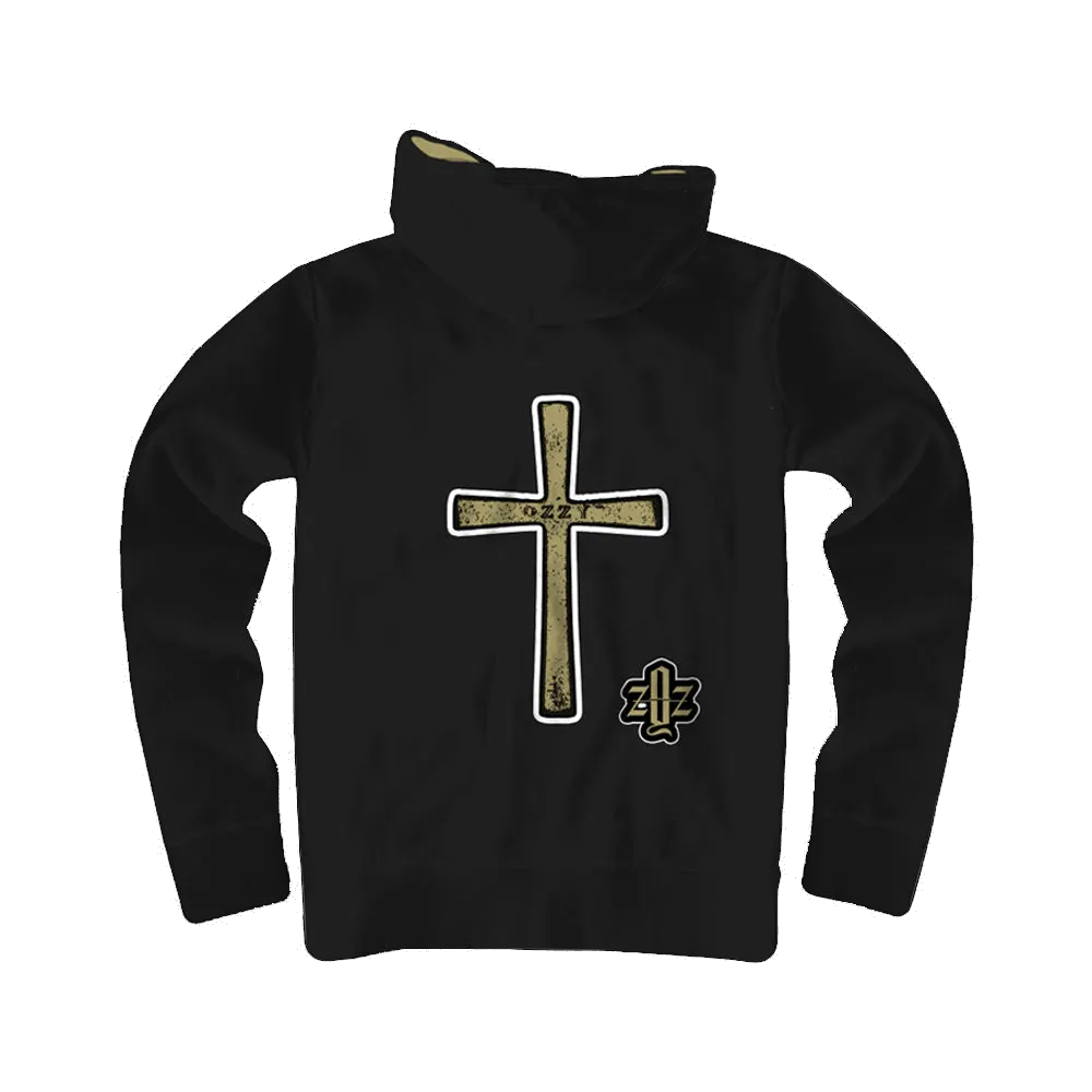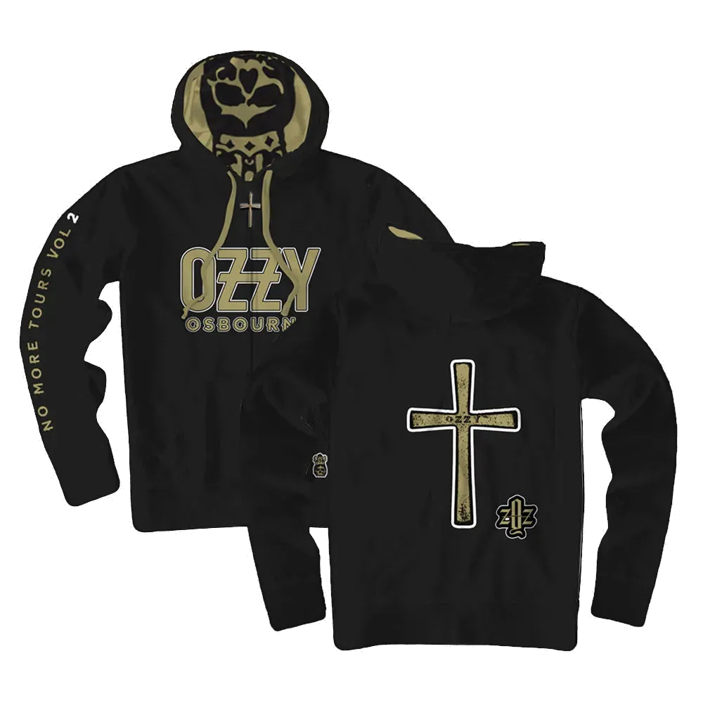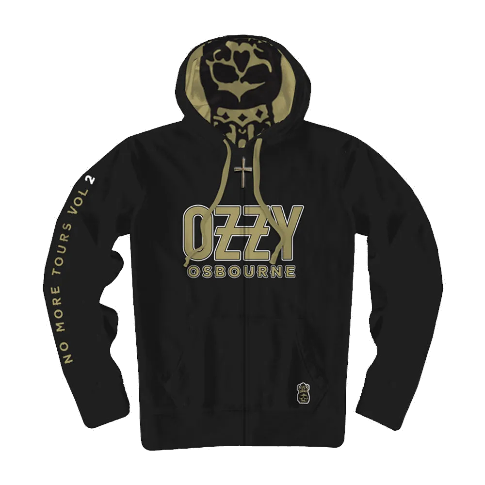 The Ozzy Osbourne 'No More Tours Black Zip Hoodie' features the Ozzy Osbourne logo complete with 'No More Tours 2' written down the sleeve. The back is complete with cross artwork, and the hood features skull artwork printed on the inside.