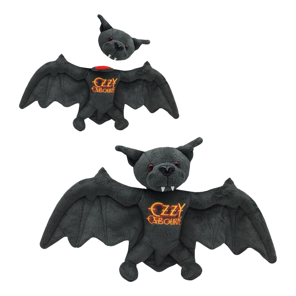 The Ozzy Osbourne Plush Bat is a web exclusive. Bring the legendary moment in rock history to life with this soft toy Plush Bat, featuring the Ozzy Osbourne logo and a velcro detachable head.
